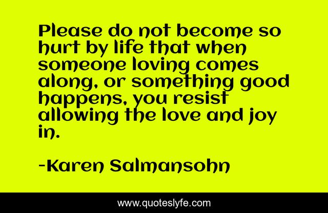 This page presents the quote "Please do not become so hurt by life that when someone loving comes along, or something good happens, you resist allowing the love and joy in.". Author of this quote is Karen Salmansohn. This quote is about toxic-love, break-ups, self-love,.