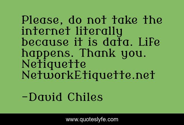 This page presents the quote "Please, do not take the internet literally because it is data. Life happens. Thank you. Netiquette NetworkEtiquette.net". Author of this quote is David Chiles. This quote is about etiquette, social-media, social-network, rules, netiquette-rules, blog, netiquette, internet, network-etiquette,.