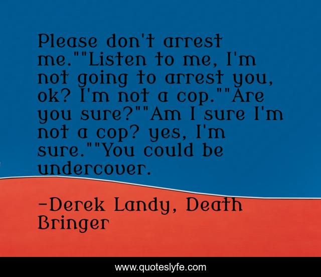 This page presents the quote "Please don't arrest me.""Listen to me, I'm not going to arrest you, ok? I'm not a cop.""Are you sure?""Am I sure I'm not a cop? yes, I'm sure.""You could be undercover.". Author of this quote is Derek Landy, Death Bringer. This quote is about make-me-laugh, funny, clever, humour, awesome, witty, hilarious, epic, comedy,.