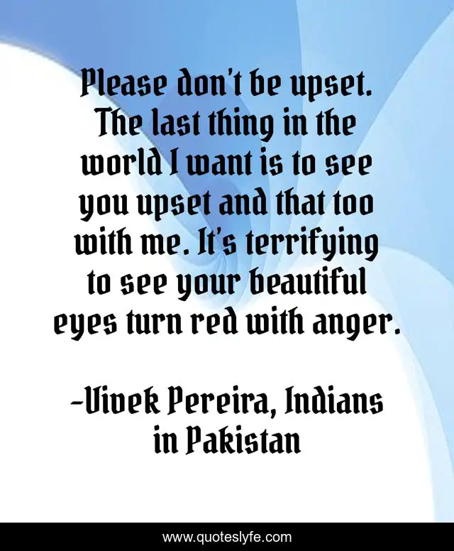 This page presents the quote "Please don’t be upset. The last thing in the world I want is to see you upset and that too with me. It’s terrifying to see your beautiful eyes turn red with anger.". Author of this quote is Vivek Pereira, Indians in Pakistan. This quote is about fiction-novel, famous, book, quaotation, quote,.