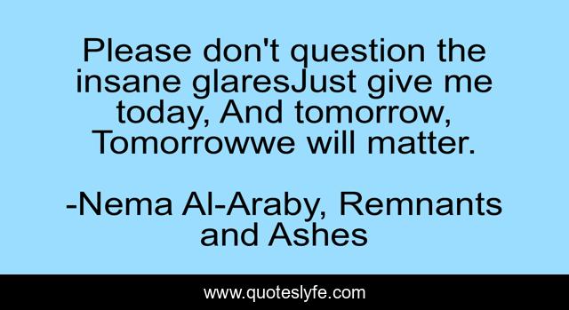 This page presents the quote "Please don't question the insane glaresJust give me today, And tomorrow, Tomorrowwe will matter.". Author of this quote is Nema Al-Araby, Remnants and Ashes. .