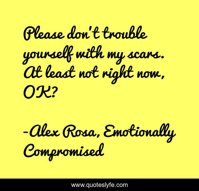 This page presents the quote "Please don't trouble yourself with my scars. At least not right now, OK?". Author of this quote is Alex Rosa, Emotionally Compromised. This quote is about spy, love, scars, damage, hurt, pain, hate, affection,.