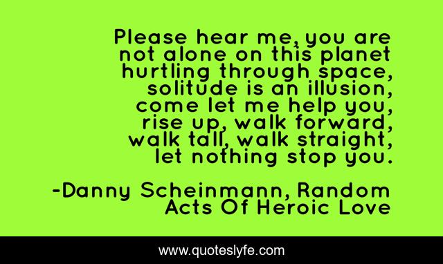 This page presents the quote "Please hear me, you are not alone on this planet hurtling through space, solitude is an illusion, come let me help you, rise up, walk forward, walk tall, walk straight, let nothing stop you.". Author of this quote is Danny Scheinmann, Random Acts Of Heroic Love. This quote is about enthusiasm, strength, inspirational,.