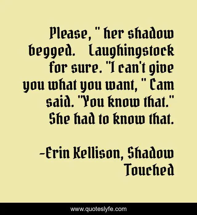 This page presents the quote "Please, " her shadow begged. Laughingstock for sure. "I can't give you what you want, " Cam said. "You know that." She had to know that.". Author of this quote is Erin Kellison, Shadow Touched. This quote is about magic, paranormal, dark, mages, uf, fae,.