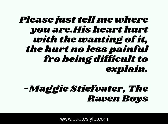 This page presents the quote "Please just tell me where you are.His heart hurt with the wanting of it, the hurt no less painful fro being difficult to explain.". Author of this quote is Maggie Stiefvater, The Raven Boys. This quote is about raven-boys, gansey, raven-cycle, please, hurt, he-understands-so-well, gosh,.