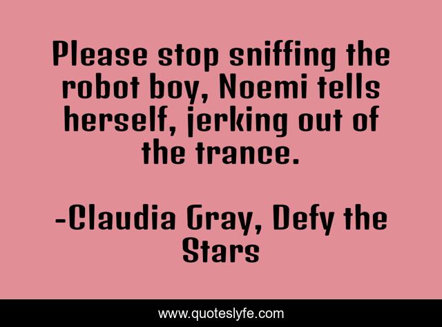 This page presents the quote "Please stop sniffing the robot boy, Noemi tells herself, jerking out of the trance.". Author of this quote is Claudia Gray, Defy the Stars. This quote is about romance, humor, robot, sci-fi,.