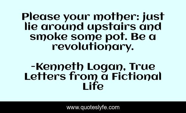 This page presents the quote "Please your mother: just lie around upstairs and smoke some pot. Be a revolutionary.". Author of this quote is Kenneth Logan, True Letters from a Fictional Life. This quote is about coming-out, teen, high-school, ya, activism, glbt, romance, lgbt, parents,.
