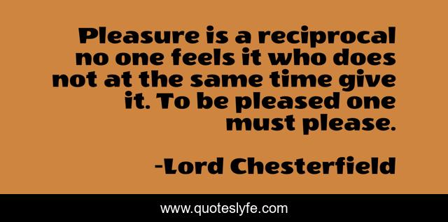 This page presents the quote "Pleasure is a reciprocal no one feels it who does not at the same time give it. To be pleased one must please.". Author of this quote is Lord Chesterfield. .