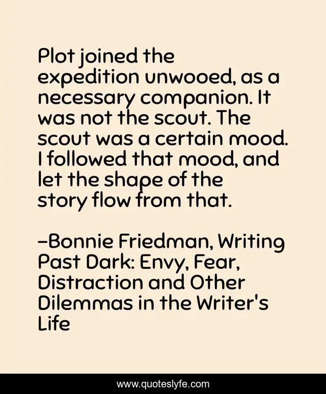 This page presents the quote "Plot joined the expedition unwooed, as a necessary companion. It was not the scout. The scout was a certain mood. I followed that mood, and let the shape of the story flow from that.". Author of this quote is Bonnie Friedman, Writing Past Dark: Envy, Fear, Distraction and Other Dilemmas in the Writer's Life. This quote is about plot, writing-advice,.