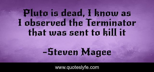 This page presents the quote "Pluto is dead, I know as I observed the Terminator that was sent to kill it". Author of this quote is Steven Magee. This quote is about observer, astronomical, terminate, dead, observed, astronomer, kill, terminator, terminated,.
