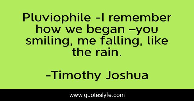 This page presents the quote "Pluviophile -I remember how we began –you smiling, me falling, like the rain.". Author of this quote is Timothy Joshua. This quote is about quote, love, rain, affection,.