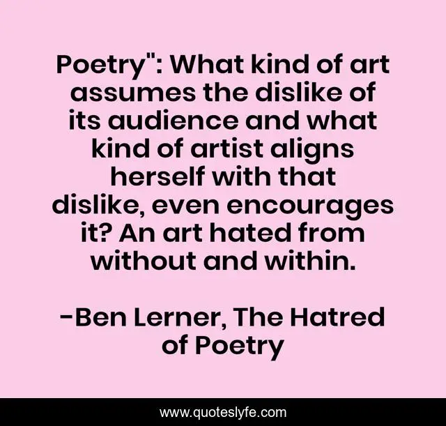 This page presents the quote "Poetry": What kind of art assumes the dislike of its audience and what kind of artist aligns herself with that dislike, even encourages it? An art hated from without and within.". Author of this quote is Ben Lerner, The Hatred of Poetry. This quote is about poems, hatred, poetry,.