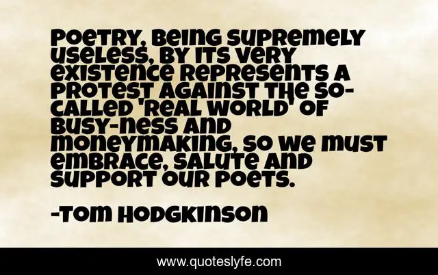 This page presents the quote "Poetry, being supremely useless, by its very existence represents a protest against the so-called 'real world' of busy-ness and moneymaking, so we must embrace, salute and support our poets.". Author of this quote is Tom Hodgkinson. This quote is about world, support, existence,.