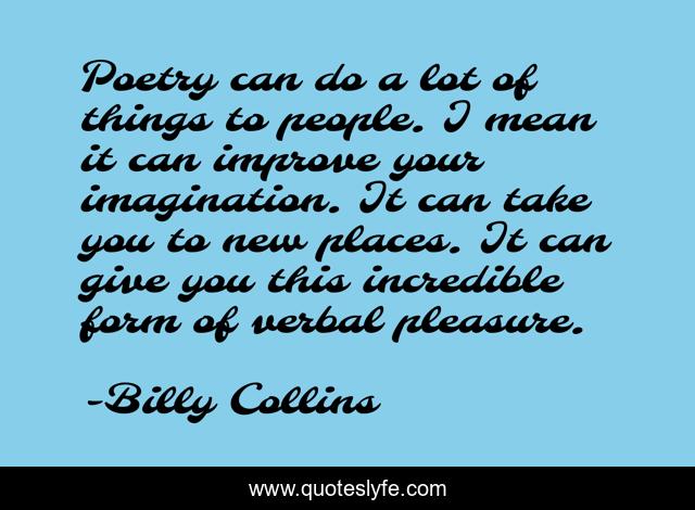 This page presents the quote "Poetry can do a lot of things to people. I mean it can improve your imagination. It can take you to new places. It can give you this incredible form of verbal pleasure.". Author of this quote is Billy Collins. This quote is about poetry, people,.
