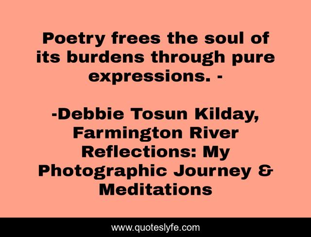 This page presents the quote "Poetry frees the soul of its burdens through pure expressions. -". Author of this quote is Debbie Tosun Kilday, Farmington River Reflections: My Photographic Journey & Meditations. This quote is about quote, quotes, debbie-tosun-kilday, quotes-to-live-by,.