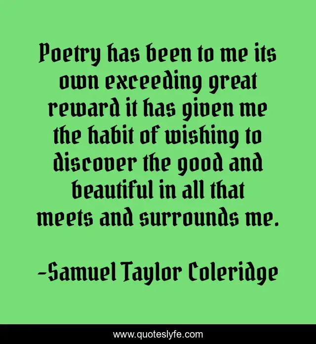 This page presents the quote "Poetry has been to me its own exceeding great reward it has given me the habit of wishing to discover the good and beautiful in all that meets and surrounds me.". Author of this quote is Samuel Taylor Coleridge. This quote is about beautiful, great, good,.