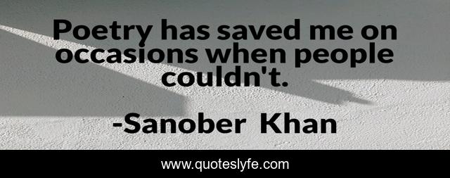 This page presents the quote "Poetry has saved me on occasions when people couldn't.". Author of this quote is Sanober Khan. This quote is about poets, people, poetry, emotions, writers, poetry-love, thoughts,.
