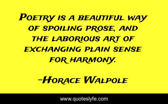 This page presents the quote "Poetry is a beautiful way of spoiling prose, and the laborious art of exchanging plain sense for harmony.". Author of this quote is Horace Walpole. This quote is about beautiful, art, harmony,.