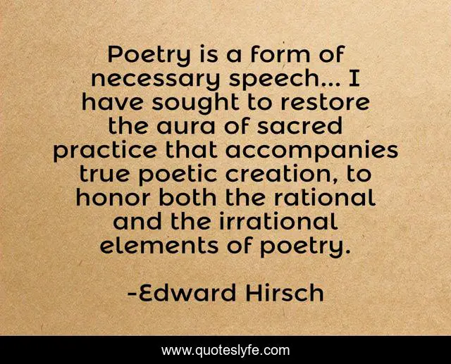 This page presents the quote "Poetry is a form of necessary speech... I have sought to restore the aura of sacred practice that accompanies true poetic creation, to honor both the rational and the irrational elements of poetry.". Author of this quote is Edward Hirsch. This quote is about practice, speech, honor,.