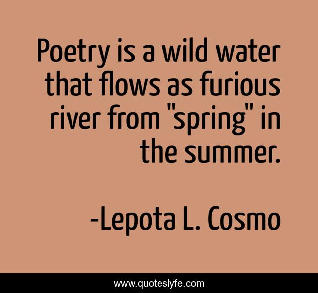 This page presents the quote "Poetry is a wild water that flows as furious river from "spring" in the summer.". Author of this quote is Lepota L. Cosmo. This quote is about water, summer, river, wild, poetry,.