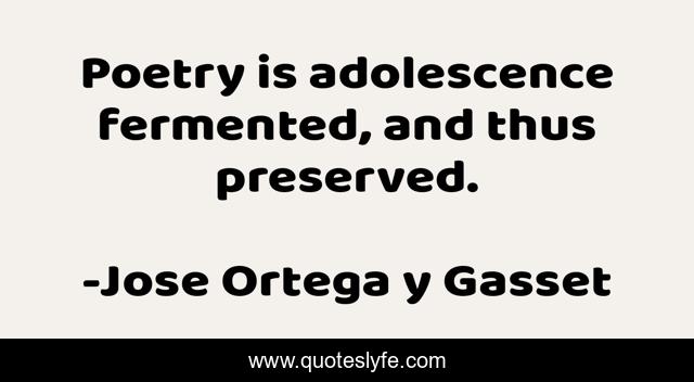 This page presents the quote "Poetry is adolescence fermented, and thus preserved.". Author of this quote is Jose Ortega y Gasset. This quote is about thus, preserved, adolescence,.