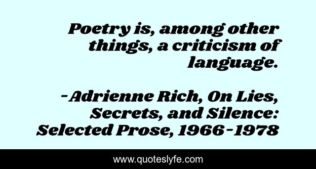 "Adrienne Rich, On Lies, Secrets, and Silence: Selected Prose, 1966-1978 Quotes." Quoteslyfe.com, 2025. Sat. 06 Dec. 2025. <https://www.quoteslyfe.com/quote/Poetry-is-among-other-things-a-criticism-159356>.