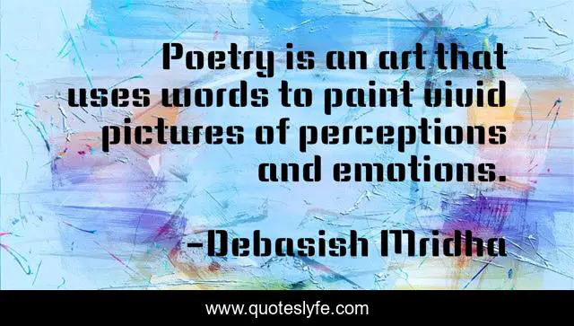 This page presents the quote "Poetry is an art that uses words to paint vivid pictures of perceptions and emotions.". Author of this quote is Debasish Mridha. This quote is about paint-vivid-pictures, debasish-mridha, philosophy, poetry-is-an-art, poetry, quotes, inspirational, enthusiasm, debasish-mridha-m-d,.