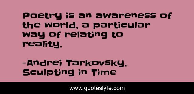 This page presents the quote "Poetry is an awareness of the world, a particular way of relating to reality.". Author of this quote is Andrei Tarkovsky, Sculpting in Time. This quote is about art, thought-provoking, poetry, inspirational, enthusiasm,.