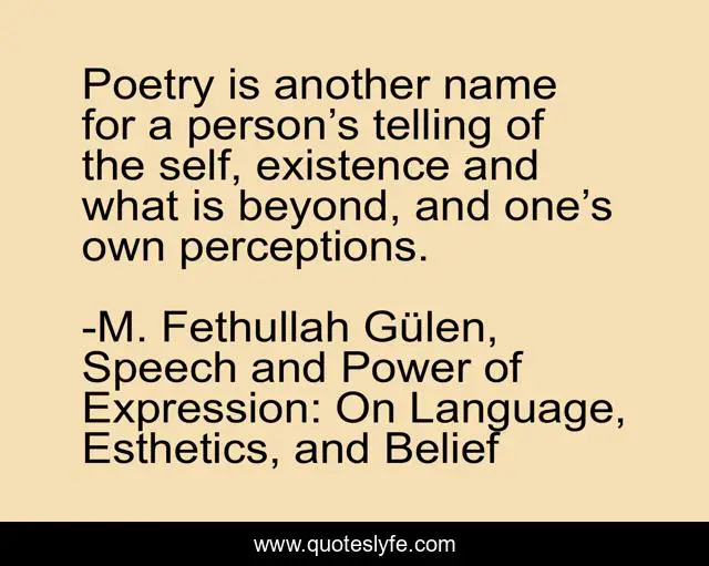 This page presents the quote "Poetry is another name for a person’s telling of the self, existence and what is beyond, and one’s own perceptions.". Author of this quote is M. Fethullah Gülen, Speech and Power of Expression: On Language, Esthetics, and Belief. This quote is about poet, poem, poetry,.
