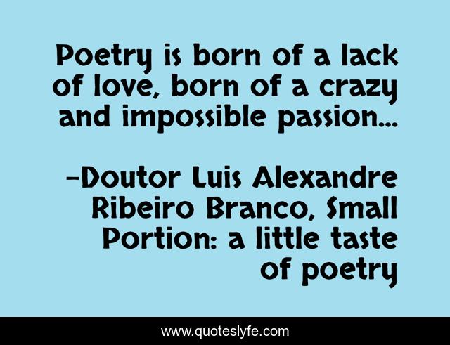 This page presents the quote "Poetry is born of a lack of love, born of a crazy and impossible passion...". Author of this quote is Doutor Luis Alexandre Ribeiro Branco, Small Portion: a little taste of poetry. .