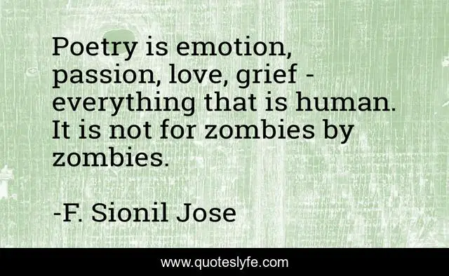 This page presents the quote "Poetry is emotion, passion, love, grief - everything that is human. It is not for zombies by zombies.". Author of this quote is F. Sionil Jose. This quote is about grief, love, passion, affection,.