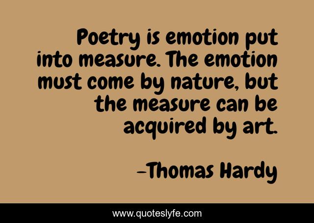 This page presents the quote "Poetry is emotion put into measure. The emotion must come by nature, but the measure can be acquired by art.". Author of this quote is Thomas Hardy. This quote is about art, poetry, measure,.