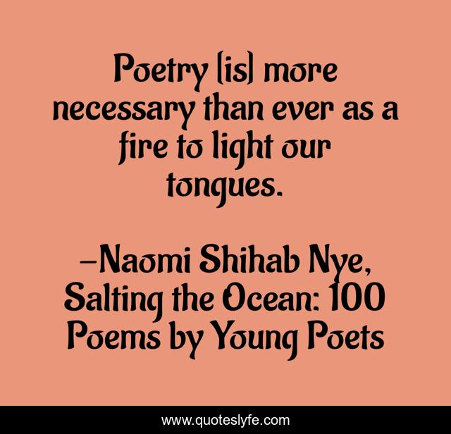 This page presents the quote "Poetry [is] more necessary than ever as a fire to light our tongues.". Author of this quote is Naomi Shihab Nye, Salting the Ocean: 100 Poems by Young Poets. .