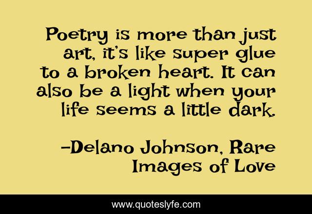This page presents the quote "Poetry is more than just art, it’s like super glue to a broken heart. It can also be a light when your life seems a little dark.". Author of this quote is Delano Johnson, Rare Images of Love. This quote is about heart, art, poetry,.