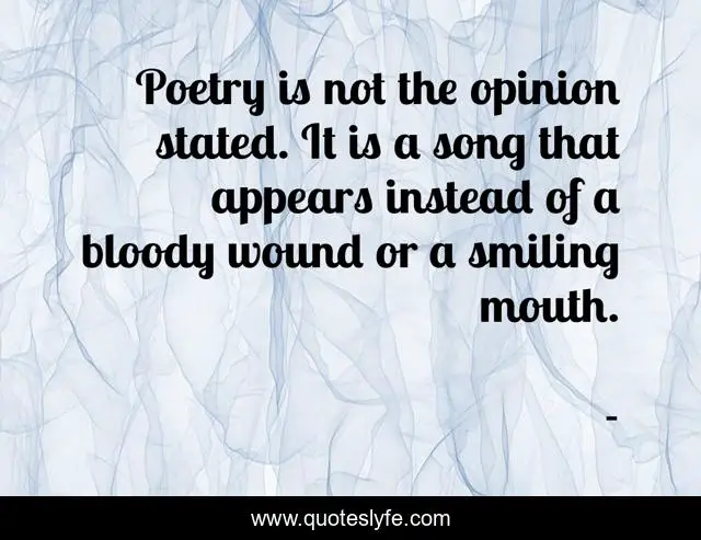 This page presents the quote "Poetry is not the opinion stated. It is a song that appears instead of a bloody wound or a smiling mouth.". Author of this quote is . This quote is about love, inspirational-love, inspirational, inspirational-living, enthusiasm, affection, inspiration,.