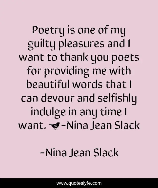 This page presents the quote "Poetry is one of my guilty pleasures and I want to thank you poets for providing me with beautiful words that I can devour and selfishly indulge in any time I want. ♥-Nina Jean Slack". Author of this quote is Nina Jean Slack. This quote is about beautiful, poem, poets, pleasure, love, selfish, guilty, poetry, devour,.