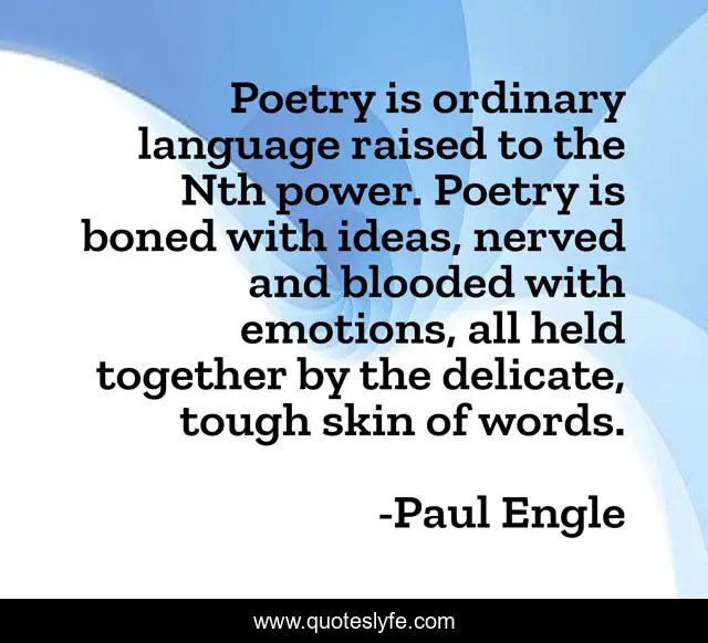This page presents the quote "Poetry is ordinary language raised to the Nth power. Poetry is boned with ideas, nerved and blooded with emotions, all held together by the delicate, tough skin of words.". Author of this quote is Paul Engle. This quote is about power, together, words,.