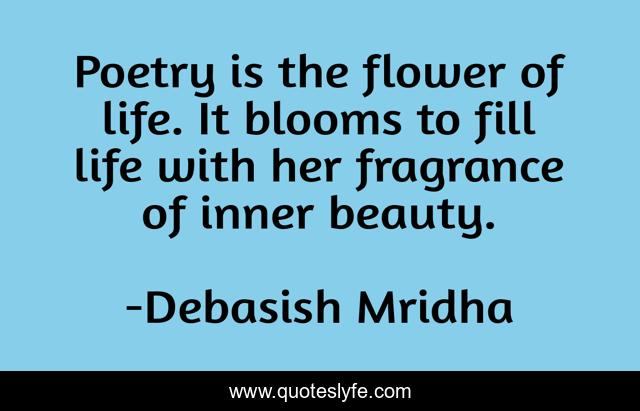 This page presents the quote "Poetry is the flower of life. It blooms to fill life with her fragrance of inner beauty.". Author of this quote is Debasish Mridha. This quote is about inner-beauty, what-is-poetry, flower-of-life, philosophy, debasish-mridha, poetry, quotes, debasish-mridha-md, inspirational,.