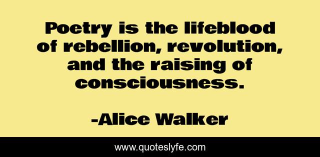 This page presents the quote "Poetry is the lifeblood of rebellion, revolution, and the raising of consciousness.". Author of this quote is Alice Walker. This quote is about revolution, rebellion,.
