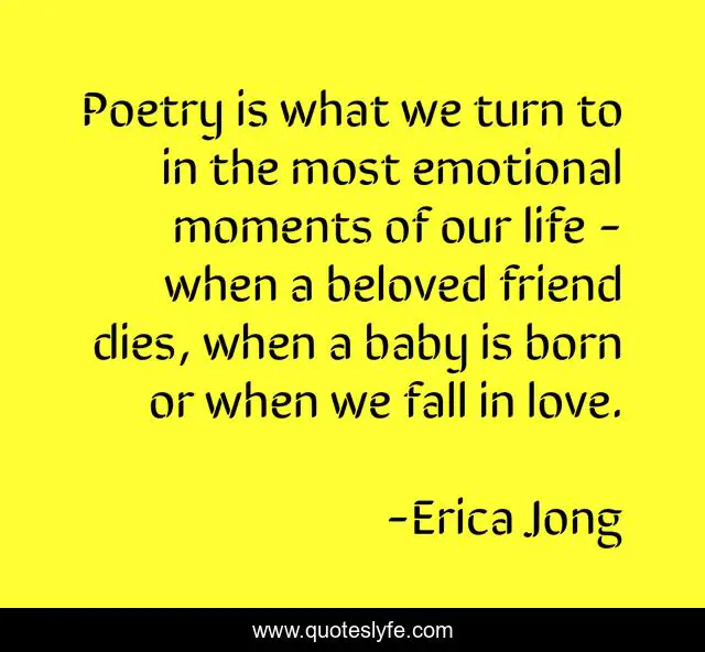 This page presents the quote "Poetry is what we turn to in the most emotional moments of our life - when a beloved friend dies, when a baby is born or when we fall in love.". Author of this quote is Erica Jong. This quote is about baby, life, love, affection,.