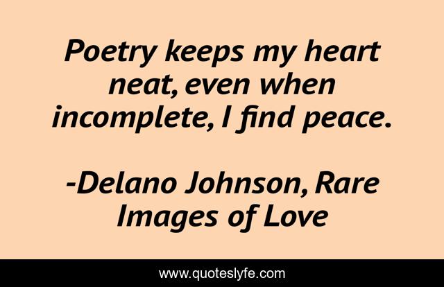 This page presents the quote "Poetry keeps my heart neat, even when incomplete, I find peace.". Author of this quote is Delano Johnson, Rare Images of Love. This quote is about heart, love, peace, poetry, poet, affection,.