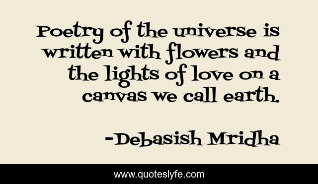 This page presents the quote "Poetry of the universe is written with flowers and the lights of love on a canvas we call earth.". Author of this quote is Debasish Mridha. This quote is about love, universe, philosophy, debasish-mridha, poetry, quotes, inspirational, earth, enthusiasm,.