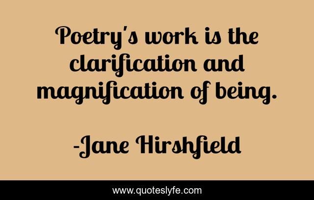 This page presents the quote "Poetry's work is the clarification and magnification of being.". Author of this quote is Jane Hirshfield. .