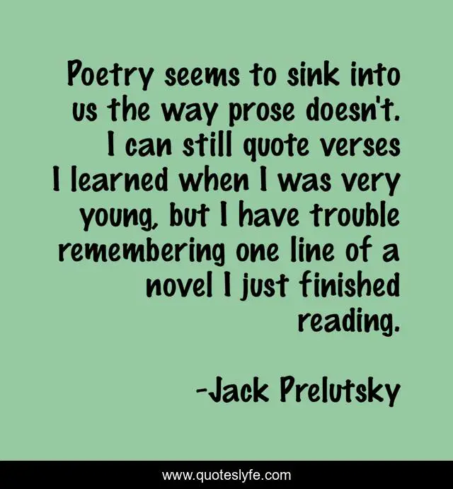 This page presents the quote "Poetry seems to sink into us the way prose doesn't. I can still quote verses I learned when I was very young, but I have trouble remembering one line of a novel I just finished reading.". Author of this quote is Jack Prelutsky. This quote is about reading, young, i can,.