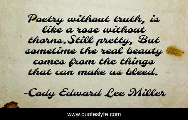 This page presents the quote "Poetry without truth, is like a rose without thorns.Still pretty, But sometime the real beauty comes from the things that can make us bleed.". Author of this quote is Cody Edward Lee Miller. This quote is about emotion, real, pain, rose, poetry, blood, truth, thorns,.