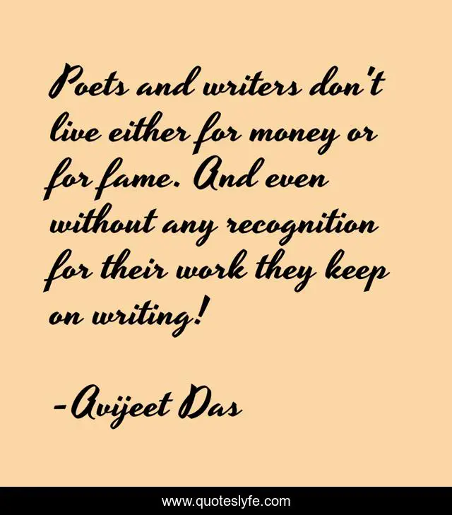 This page presents the quote "Poets and writers don't live either for money or for fame. And even without any recognition for their work they keep on writing!". Author of this quote is Avijeet Das. This quote is about poets, money, work, writing, writers, fame, recognition,.