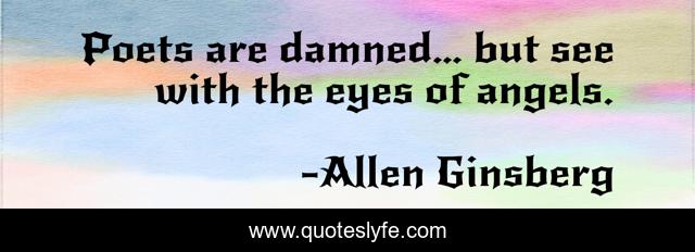 This page presents the quote "Poets are damned… but see with the eyes of angels.". Author of this quote is Allen Ginsberg. This quote is about eyes, beauty, hope, poetry, perspective, sight, poets, angels, vision,.