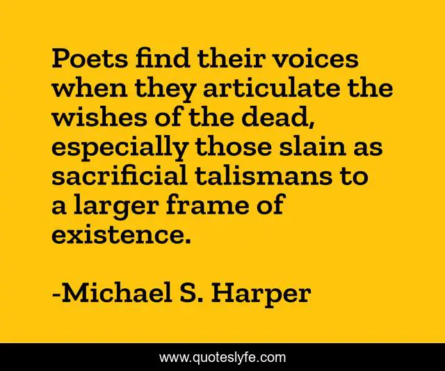 This page presents the quote "Poets find their voices when they articulate the wishes of the dead, especially those slain as sacrificial talismans to a larger frame of existence.". Author of this quote is Michael S. Harper. .