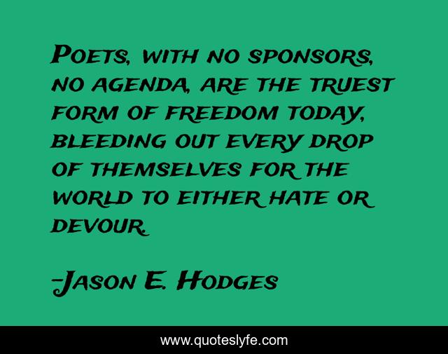 This page presents the quote "Poets, with no sponsors, no agenda, are the truest form of freedom today, bleeding out every drop of themselves for the world to either hate or devour.". Author of this quote is Jason E. Hodges. This quote is about quotes, writers-on-writing, poetry,.