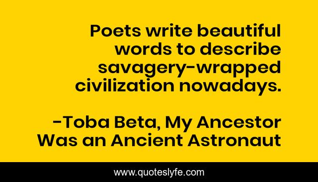 This page presents the quote "Poets write beautiful words to describe savagery-wrapped civilization nowadays.". Author of this quote is Toba Beta, My Ancestor Was an Ancient Astronaut. This quote is about civilization, savagery,.